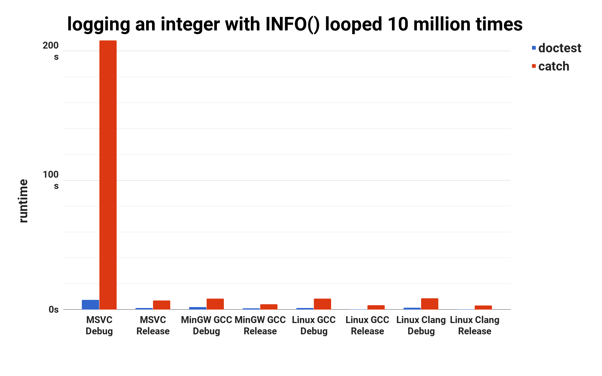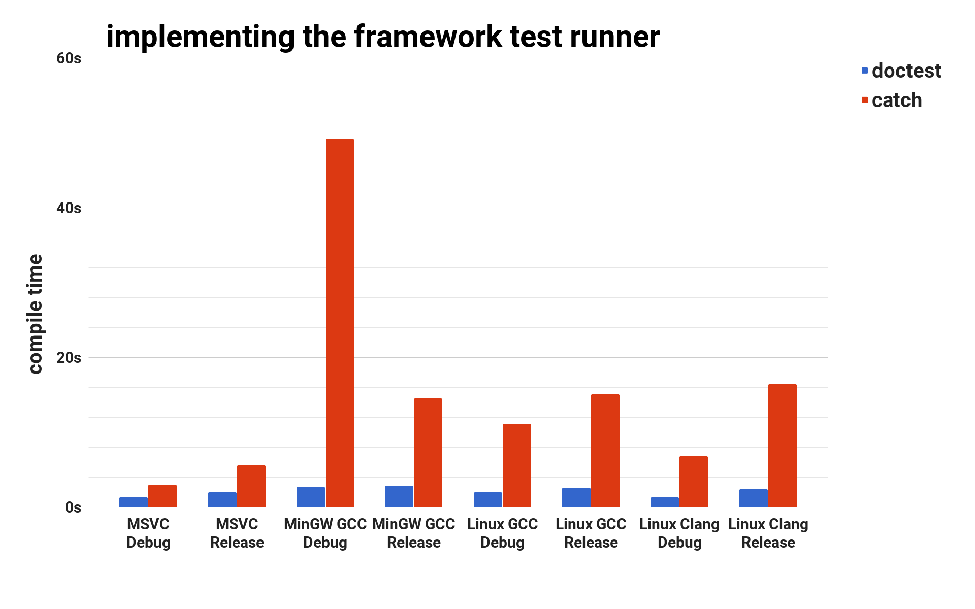 The results are in seconds and are in **no way** intended to bash [**Catch**](https://github.com/catchorg/Catch2) - the **doctest** framework wouldn't exist without it.